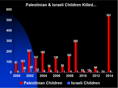 She showed a chart comparing side by side the number of Israeli and Palestinian children killed during the same time period. She continued, “In the round of violence that began in 2000 you’ll notice that 91 Palestinian children were killed before a single Israeli child was killed. The media always tells us that Israelis are defending themselves.”